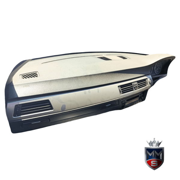 This dashboard is removed from a 2007 BMW 320d E90 Sedan and is suitable for replacing a damaged or worn interior dash on the same model.