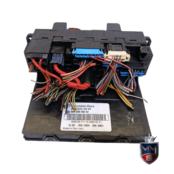 This front SAM (Signal Acquisition Module) unit is removed from Mercedes-Benz W203 and W209 models. It controls and distributes electrical signals across various vehicle systems, ensuring proper operation of lighting, wipers, and other electronic components.